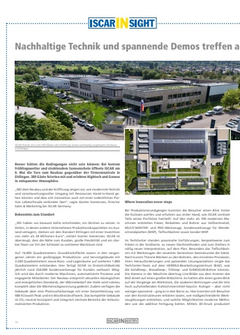 Nachhaltige Technik und spannende Demos treffen auf Foodtruck-Feeling in der SonneBesser h%u00e4tten die Bedingungen nicht sein k%u00f6nnen: Bei bestem Fr%u00fchlingswetter und strahlendem Sonnenschein %u00f6ffnete ISCAR am 8. Mai die Tore zum Neubau gegen%u00fcber der Firmenzentrale in Ettlingen. 300 G%u00e4ste feierten mit und erlebten Hightech und Genuss in entspannter Atmosph%u00e4re. %u201eMit dem Neubau und der Er%u00f6ffnung zeigen wir, wie modernste Technik und verantwortungsvoller Umgang mit Ressourcen Hand-in-Hand gehen k%u00f6nnen und dass sich Innovation auch mit einer ordentlichen Portion Lebensfreude verbinden l%u00e4sst%u201c, sagte G%u00fcnter Szerencses, Director Sales & Marketing bei ISCAR Germany.Bekenntnis zum Standort%u201eWir haben uns bewusst daf%u00fcr entschieden, ein Zeichen zu setzen. In Zeiten, in denen andere Unternehmen Produktionskapazit%u00e4ten ins Ausland verlagern, st%u00e4rken wir den Standort Ettlingen mit einer Investition von mehr als 30 Millionen Euro%u201c, erkl%u00e4rt G%u00fcnter Szerencses. ISCAR ist %u00fcberzeugt, dass die N%u00e4he zum Kunden, gro%u00dfe Flexibilit%u00e4t und ein starkes Team vor Ort der Schl%u00fcssel zu weiterem Wachstum sind.Auf 16.000 Quadratmetern Grundst%u00fccksfl%u00e4che waren in den vergangenen Jahren ein gro%u00dfz%u00fcgiges Produktions- und Servicegeb%u00e4ude mit 3.200 Quadratmetern sowie B%u00fcro- und Lagerr%u00e4ume auf weiteren 1.800 Quadratmetern entstanden. Hier fertigt ISCAR im Dreischichtbetrieb j%u00e4hrlich rund 250.000 Sonderwerkzeuge f%u00fcr Kunden weltweit. M%u00f6glich wird das durch moderne Maschinen, automatisierte Prozesse und engagierte Mitarbeiter. Der Neubau entspricht aktuellen %u00f6kologischen und energetischen Standards, der W%u00e4rmebedarf der Halle wird nahezu komplett %u00fcber die W%u00e4rmer%u00fcckgewinnung gedeckt. Zudem verf%u00fcgen die Geb%u00e4ude %u00fcber eine Photovoltaikanlage mit einer Gesamtleistung von 480 Kilowatt Peak und ein Blockheizkraftwerk. Das komplette Geb%u00e4ude ist CO2-neutral konzipiert und integriert zentrale Bereiche der teilautomatisierten Produktion.Where innovation never stopsBei Produktionsrundg%u00e4ngen konnten die Besucher einen Blick hinter die Kulissen werfen und erfuhren aus erster Hand, wie ISCAR zentrale Teile seines Portfolios herstellt: Auf den mehr als 100 modernen Maschinen entstehen Fr%u00e4ser, Reibahlen und Bohrer aus Vollhartmetall, MULTI-MASTER- und PKD-Werkzeuge, Sonderwerkzeuge f%u00fcr Wendeschneidplatten (WSP), Tieflochbohrer sowie Sonder-WSP.Im TechCenter standen praxisnahe Vorf%u00fchrungen, beispielsweise zum Fr%u00e4sen in der Gro%u00dfserie, zu neuen Stechmethoden und zum Drehen in v%u00f6llig neuer Interpretation, auf dem Plan. Besonders das Tieflochbohren mit Werkzeugen der neuesten Generation beeindruckte die G%u00e4ste.Nach kurzen Theorie-Bl%u00f6cken zu den Bohrern, den einzelnen Prozessen, ihren Herausforderungen und passenden L%u00f6sungsans%u00e4tzen zeigte das TechCenter-Team auf dem HERMLE-Bearbeitungszentrum (BAZ), was die SolidDeep-, BrazeDeep-, TriDeep- und SUMOGUN-Bohrer k%u00f6nnen.Die Kamera in der Maschine %u00fcbertrug Live-Bilder aus dem Inneren des BAZ direkt auf einen gro%u00dfen Bildschirm. So hatten alle einen guten Blick auf die Vorg%u00e4nge am Werkst%u00fcck, die sauberen Bohrungen und die teils hoch aufschie%u00dfenden K%u00fchlschmiermittel-Geysire. Ruhiger %u2013 aber nicht weniger spannend %u2013 ging es in den B%u00fcros zu. Hier konnten sich Besucher von den Konstrukteuren erkl%u00e4ren lassen, wie ma%u00dfgeschneiderte Werkzeugl%u00f6sungen entstehen, und welche M%u00f6glichkeiten moderne Methoden wie die additive Fertigung bieten. Mittels 3D-Druck produziert ISCAR feierte mit rund 300 G%u00e4sten die Er%u00f6ffnung seines nachhaltig ausgelegten Neubausin Ettlingen.10