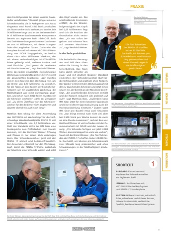 PRAXISFR%u00c4SEN BOHREN DREHEN STECHEN INDUSTRIENMit der neuen L%u00f6sung kann IMS Gear den Einstich schnellerund prozesssicherer einbringen.F%u00fcr den einfachen und bedienerfreundlichen Plattenwechsel liegen vorbereitete Wechselk%u00f6pfe bereit. Das reduziert die R%u00fcstzeiten praktisch auf null. dem Einstichprozess bei einem unserer Dauerl%u00e4ufer unzufrieden.%u201c Konkret ging es um eine Schneckenwelle, die in Parksperren von Autos eingesetzt wird. Rund 2.500 St%u00fcck produziert das Team um Berthold Weisser pro Woche. Die 76 Millimeter lange und an der breitesten Stelle 13 Millimeter durchmessende Komponente besteht aus legiertem Stahl 16MnCrS5. Basis sind Drei-Meter-Stangen mit einem Durchmesser von 14 Millimetern, mit denen Stangenlader die Langdreher f%u00fcttern. Darin wird das komplexe Bauteil mit einem NEOSWISS-Werkzeug von ISCAR l%u00e4ngsgedreht, es besitzt einen circa zehn Millimeter Vierkant, der mit einem sechsschneidigen MULTIMASTERFr%u00e4ser gefertigt wird, mehrere Ans%u00e4tze und zwei Einstiche. %u201eUnd genau die bereiteten mir Bauchschmerzen%u201c, sagt Berthold Weisser.Denn das bisher eingesetzte zweischneidige Werkzeug eines Marktbegleiters lieferte nicht die gew%u00fcnschten Ergebnisse. %u201eWir mussten immer zwei Mal mit dem Werkzeug rein, um die Breite von 0,77 Millimeter zu erreichen, f%u00fcr die Fasen an den Kanten der Einstiche ben%u00f6tigten wir ein zus%u00e4tzliches Werkzeug, die Ma%u00dfhaltigkeit war nicht durchg%u00e4ngig gegeben, und schon nach 2.000 Teilen mussten wir die Schneide wechseln%u201c, z%u00e4hlt der Zerspaner auf. %u201eZu allem %u00dcberfluss war der Schneidenwechsel f%u00fcr den Bediener nicht angenehm und dauerte obendrein auch noch lang.%u201cMatthias Boss schlug f%u00fcr diese Anwendung den NEOSWISS mit Wechselkopf f%u00fcr die f%u00fcnfschneidige Wendeschneidplatte PENTA 17 mit einer Schnittbreite von 0,7 Millimetern vor.Statt des Standards sollte bei IMS Gear eine Sonderplatte zum Profilstechen zum Einsatz kommen, mit der Berthold Weisser %u00d6ffnung und Phasen in nur einem Stich einbringen kann. Der Schneidenwechsel geht mit der PENTA 17 schnell und bedienerfreundlich.Der Anwender entnimmt nur den Werkzeugkopf, dreht die PENTA 17-Platte au%u00dferhalb der Maschine eine Schneide weiter und setzt den Kopf wieder ein. Das anschlie%u00dfende Einmessen entf%u00e4llt, da die Wiederholgenauigkeit des Kopfs bei 0,05 Millimetern liegt und sich die Position der Grundhalter nicht ver%u00e4ndert. %u201eIch war sofort begeistert und stimmte Tests auf unseren Maschinen zu%u201c, sagt Berthold Weisser.In der Serie produktiverDie Probel%u00e4ufe %u00fcberzeugten und IMS Gear %u00fcbernahm die L%u00f6sung in den Serienbetrieb. Das Team kann damit schneller als zuvor und mit deutlich l%u00e4ngerer Standzeit einstechen. Der Schneidenwechsel l%u00e4uft bedienerfreundlich und praktisch ohne R%u00fcstzeit.Der Werker entnimmt den Werkzeugkopf mit der zu tauschenden Schneide und setzt einen neuen ein, der bereits an der Maschine bereitliegt. %u201eEin anschlie%u00dfendes Einmessen entf%u00e4llt und die R%u00fcstzeit reduziert sich praktisch auf null%u201c, sagt Matthias Boss. %u201eAu%u00dferdem kann IMS Gear jetzt f%u00fcr einen besseren Spanbruch und eine leichtere Spanevakuierung auch die Hochdruckk%u00fchlung einsetzen.%u201c Zudem spart IMS Gear pro Bauteil etwa zwei Sekunden ein. %u201eDas klingt erstmal nach nicht viel, aber bei 2.500 St%u00fcck pro Woche kommt da mehr als eine Stunde zusammen%u201c, rechnet Boss vor.Berthold Weisser ist voll zufrieden mit der Zusammenarbeit mit ISCAR und der neuen L%u00f6sung: %u201ePro Schneide fertigen wir jetzt 4.000 Wellen, das sind doppelt so viele wie vorher%u201c, freut sich Berthold Weisser. %u201eDie f%u00fcnf Schneiden der PENTA 17 schaffen locker 20.000 Teile. Das hei%u00dft, wir k%u00f6nnen pro Schneideinsatz zwei Monate lang prozesssicher und ohne Schwankungen in der Ma%u00dfhaltigkeit produzieren.%u201c Berthold Weisser, Manufacturing Engineering bei IMS Gear (li.), und Matthias Boss, technische Beratung und Vertrieb bei ISCAR, arbeiten seit vielen Jahren auf Augenh%u00f6he zusammen und haben sich gemeinsam die neue L%u00f6sung ausgedacht.Berthold Weisser, Manufacturing Engineering bei IMS GearSHORTCUTAUFGABE: Einstechen und Kopieren bei Schneckenwellen aus legiertem Stahl L%u00d6SUNG: Profilstechen mit NEOSWISS Wechselkopfsystem und PENTA 17-Sonderplatte NUTZEN: H%u00f6here Standzeit, wirtschaftlicher, schnellerer und sicherer Prozess, h%u00f6here Produktivit%u00e4t, verl%u00e4ssliche Qualit%u00e4t, bedienerfreundliches System iDie f%u00fcnf Schneiden der PENTA 17 schaffen locker 20.000 Teile. Das hei%u00dft, wir k%u00f6nnen pro Schneideinsatz zwei Monate lang prozesssicher und ohne Schwankungen in der Ma%u00dfhaltigkeit produzieren.51
