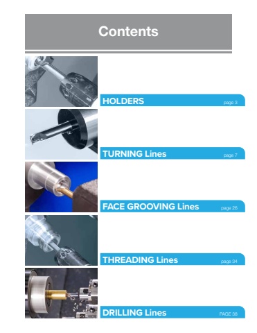 ContentsHOLDERS page 3TURNING Lines page 7FACE GROOVING Lines page 26THREADING Lines page 34DRILLING Lines PAGE 38