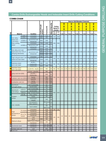 129GENERAL PURPOSE DRILLINGCombo Drills Exchangeable Heads and Indexable Insert Drills Cutting ConditionsCOMBI-CHAM ISOMaterial Condition Tensile Strength [N/mm2] Hardness HB Material Group No.Cutting Speed Vc[m/min]Feed vs. Drill Diameter F [mm/rev]26< %u00d8D <2829< %u00d8D <3233< %u00d8D <3536< %u00d8D <4344< %u00d8D <50VcminVcmax f min f max f min f max f min f max f min f max f min f maxPnon-alloy steel and cast steel, free cutting steel<0.25% C annealed 420 125 1 120 2000.25 0.35 0.25 0.35 0.25 0.40 0.25 0.40 0.28 0.45%u22650.25% C annealed 650 190 2<0.55% C quenched and tempered 850 250 3130 190%u22650.55% Cannealed 750 220 4quenched and tempered 1000 300 5low alloy and cast steel (less than 5% of alloying elements)annealed 600 200 6quenched and 120 180 0.25 0.33 0.25 0.33 0.25 0.38 0.25 0.38 0.26 0.43tempered930 275 71000 300 81200 350 9high alloyed steel, cast steel and tool steelannealed 680 200 10quenched and 100 160 0.25 0.33 0.25 0.33 0.25 0.36 0.25 0.36 0.26 0.41tempered 1100 325 11stainless steel and cast steelferritic / martensitic 680 200 12 90 140 0.12 0.24 0.12 0.24 0.16 0.25 0.18 0.25 0.18 0.30martensitic 820 240 13M stainless steel and cast steel austenitic, duplex 600 180 14 90 140 0.12 0.24 0.12 0.24 0.16 0.25 0.18 0.25 0.18 0.30Kgray cast iron (GG) ferritic / pearlitic 180 15150 250 0.25 0.40 0.25 0.45 0.3 0.50 0.3 0.50 0.35 0.55pearlitic / martensitic 260 16nodular cast iron (GGG) ferritic 160 17pearlitic 250 18malleable cast iron ferritic 130 19pearlitic 230 20Naluminumwrought alloysnot hardenable 60 21160 260 0.3 0.50 0.3 0.50 0.35 0.55 0.35 0.55 0.4 0.60hardenable 100 22aluminumcast alloys%u226412% Si not hardenable 75 23hardenable 90 24>12% Si high temperature 130 25copper alloys>1% Pb free cutting 110 26brass 90 27electrolytic copper100 28non metallicduroplastics, fiber plastics70 Shore D 29hard rubber 55 Shore D 30Shigh temperature alloysFe based annealed 200 31 30 600.1 0.16 0.1 0.18 0.15 0.20 0.15 0.22 0.16 0.24hardened 280 3220 50Ni or Co basedannealed 250 33hardened 350 34cast 320 35titanium alloyspure 400 190 36alpha+beta alloys, hardened 1050 310 37Hhardened steel hardened 55 HRC 38 20 50 0.1 0.16 0.12 0.18 0.14 0.2 0.14 0.2 0.16 0.22 hardened 60 HRC 39chilled cast iron cast 400 40cast iron hardened 55 HRC 41