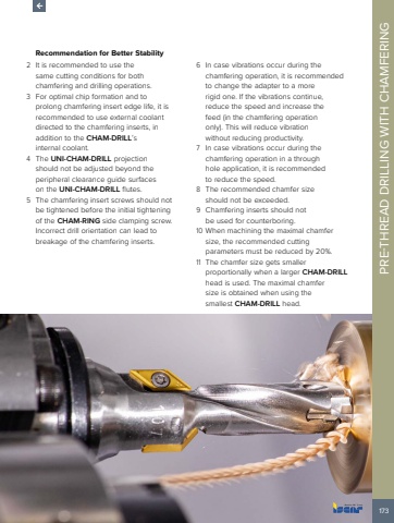 173PRE-THREAD DRILLING WITH CHAMFERING Recommendation for Better Stability2 It is recommended to use the same cutting conditions for both chamfering and drilling operations.3 For optimal chip formation and to prolong chamfering insert edge life, it is recommended to use external coolant directed to the chamfering inserts, in addition to the CHAM-DRILL%u2019s internal coolant.4 The UNI-CHAM-DRILL projection should not be adjusted beyond the peripheral clearance guide surfaces on the UNI-CHAM-DRILL flutes.5 The chamfering insert screws should not be tightened before the initial tightening of the CHAM-RING side clamping screw. Incorrect drill orientation can lead to breakage of the chamfering inserts.6 In case vibrations occur during the chamfering operation, it is recommended to change the adapter to a more rigid one. If the vibrations continue, reduce the speed and increase the feed (in the chamfering operation only). This will reduce vibration without reducing productivity.7 In case vibrations occur during the chamfering operation in a through hole application, it is recommended to reduce the speed.8 The recommended chamfer size should not be exceeded.9 Chamfering inserts should not be used for counterboring.10 When machining the maximal chamfer size, the recommended cutting parameters must be reduced by 20%.11 The chamfer size gets smaller proportionally when a larger CHAM-DRILLhead is used. The maximal chamfer size is obtained when using the smallest CHAM-DRILL head.