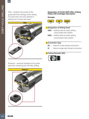 294 ISCAR DEEP HOLE DRILLINGFiller %u2013 protects the pocket of the guide pad from damage when drilling. This part does not work directly to drilling and is made with steel.FillerProtector %u2013 prevents damage of the guide pad when retracting the tool after drilling.ProtectorExplanation of ISCAR-DEEP-DRILL Drilling Heads with Cartridges DescriptionExample:DSD %u2013 EC 65.501 2 31 Designation of Drilling HeadDSD %u2013 drilling head for deep drilling using single tube systemDDD%u2013 drilling head for deep drilling using double tube system2 Connection TypeEC %u2013 external 4 start thread connectionIC %u2013 internal single start thread connection3 Cutting Diameter (DC)DC