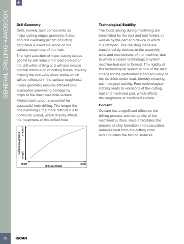 28 ISCAR GENERAL DRILLING HANDBOOKDrill GeometryDrills, namely such components as major cutting edges geometry, flutes, and drill overhang (length of cutting part) have a direct influence on the surface roughness of the hole.The right selection of major cutting edges geometry will reduce the load created on the drill while drilling and will also ensure optimal distribution of cutting forces, thereby making the drill work more stable which will be reflected in the surface roughness.Flutes geometry ensures efficient chip evacuation preventing damage by chips to the machined hole surface.Minimal tool runout is essential for successful hole drilling. The longer the drill overhangs, the more difficult it is to control its runout, which directly affects the roughness of the drilled hole. surface roughness smooth roughshort long drill overhangTechnological StabilityThe loads arising during machining are transmitted by the tool and tool holder, as well as by the part and device in which it is clamped. The resulting loads are transferred by devices to the assembly units and mechanisms of the machine, due to which a closed technological system machine-tool-part is formed. The rigidity of this technological system is one of the main criteria for the performance and accuracy of the machine under load, thereby ensuring technological stability. Poor technological stability leads to vibrations of the cutting tool and machined part, which affects the roughness of machined surface.CoolantCoolant has a significant effect on the drilling process and the quality of the machined surface, since it facilitates the process of chip formation and evacuation, removes heat from the cutting zone and lubricates the friction surfaces.