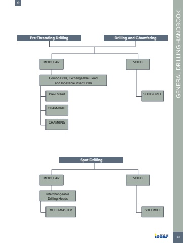 41GENERAL DRILLING HANDBOOKSOLID-DRILLSOLIDMILLDrilling and ChamferingSpot DrillingPre-Threading DrillingMODULARMODULARSOLIDSOLIDPre-ThreadMULTI-MASTERCHAM-DRILLCHAMRINGCombo Drills, Exchangeable Head and Indexable Insert DrillsInterchangeableDrilling Heads