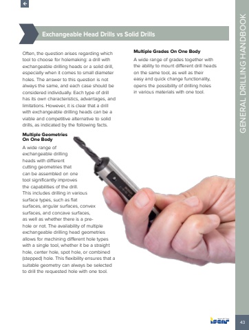 43GENERAL DRILLING HANDBOOK%u00bd%u0009Exchangeable Head Drills vs Solid DrillsOften, the question arises regarding which tool to choose for holemaking: a drill with exchangeable drilling heads or a solid drill, especially when it comes to small diameter holes. The answer to this question is not always the same, and each case should be considered individually. Each type of drill has its own characteristics, advantages, and limitations. However, it is clear that a drill with exchangeable drilling heads can be a viable and competitive alternative to solid drills, as indicated by the following facts.Multiple Geometries On One BodyA wide range of exchangeable drilling heads with different cutting geometries that can be assembled on one tool significantly improves the capabilities of the drill. This includes drilling in various surface types, such as flat surfaces, angular surfaces, convex surfaces, and concave surfaces, as well as whether there is a prehole or not. The availability of multiple exchangeable drilling head geometries allows for machining different hole types with a single tool, whether it be a straight hole, center hole, spot hole, or combined (stepped) hole. This flexibility ensures that a suitable geometry can always be selected to drill the requested hole with one tool.Multiple Grades On One BodyA wide range of grades together with the ability to mount different drill heads on the same tool, as well as their easy and quick change functionality, opens the possibility of drilling holes in various materials with one tool.