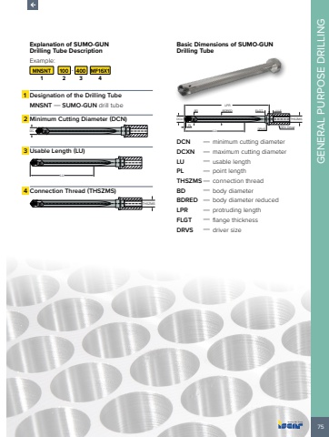75GENERAL PURPOSE DRILLINGExplanation of SUMO-GUN Drilling Tube Description Example:MNSNT 100 - 400 MF16X11 2 3 41 Designation of the Drilling TubeMNSNT %u2014 SUMO-GUN drill tube2 Minimum Cutting Diameter (DCN) DC3 Usable Length (LU) LU4 Connection Thread (THSZMS) THSZMSBasic Dimensions of SUMO-GUN Drilling TubeTHSZMSGDV DriverLU DRVSDCk7PLLPRBD BDRED FLGT 11.5DCN %u2014 minimum cutting diameterDCXN %u2014 maximum cutting diameterLU %u2014 usable lengthPL %u2014 point lengthTHSZMS %u2014 connection threadBD %u2014 body diameterBDRED %u2014 body diameter reducedLPR %u2014 protruding lengthFLGT %u2014 flange thicknessDRVS %u2014 driver size