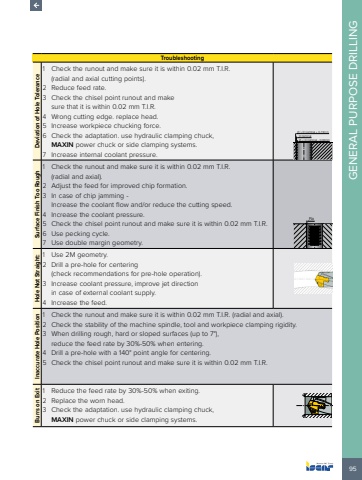 95GENERAL PURPOSE DRILLINGTroubleshootingDeviation of Hole Tolerance1 Check the runout and make sure it is within 0.02 mm T.I.R.(radial and axial cutting points).2 Reduce feed rate.3 Check the chisel point runout and make sure that it is within 0.02 mm T.I.R.4 Wrong cutting edge. replace head.5 Increase workpiece chucking force.6 Check the adaptation. use hydraulic clamping chuck, MAXIN power chuck or side clamping systems.7 Increase internal coolant pressure.%u00d8 > D nominal + 0.15mm%u00d8 < D nominal - 0.03mmD nominalSurface Finish Too Rough1 Check the runout and make sure it is within 0.02 mm T.I.R. (radial and axial).2 Adjust the feed for improved chip formation.3 In case of chip jamming - Increase the coolant flow and/or reduce the cutting speed.4 Increase the coolant pressure.5 Check the chisel point runout and make sure it is within 0.02 mm T.I.R.6 Use pecking cycle.7 Use double margin geometry.RaHole Not Straight:1 Use 2M geometry.2 Drill a pre-hole for centering (check recommendations for pre-hole operation).3 Increase coolant pressure, improve jet direction in case of external coolant supply.4 Increase the feed.Inaccurate Hole Position1 Check the runout and make sure it is within 0.02 mm T.I.R. (radial and axial).2 Check the stability of the machine spindle, tool and workpiece clamping rigidity.3 When drilling rough, hard or sloped surfaces (up to 7%u00b0), reduce the feed rate by 30%-50% when entering.4 Drill a pre-hole with a 140%u00b0 point angle for centering.5 Check the chisel point runout and make sure it is within 0.02 mm T.I.R.Burrs on Exit1 Reduce the feed rate by 30%-50% when exiting.2 Replace the worn head.3 Check the adaptation. use hydraulic clamping chuck, MAXIN power chuck or side clamping systems.