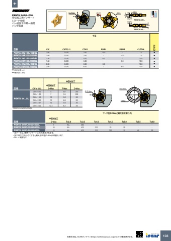 %u00b10.04 %u00d824 CDXBWPSIRRPSIRLCWPENTA 24R...PENTA 24L...CUTDIA%u5bf8%u6cd5%u578b%u756a CW CWTOL(1) CDX(2) PSIRL PSIRR CUTDIA IC1010PENTA 24L100J15DSL 1.00 0.020 3.50 15.0 - 7.0 %u2022 PENTA 24R100J15DSL 1.00 0.020 3.50 - 15.0 7.0 %u2022 PENTA 24L150J06DSL 1.50 0.020 5.00 6.0 - 10.0 %u2022 PENTA 24R150J06DSL 1.50 0.020 5.00 - 6.0 10.0 %u2022 PENTA 24L200J06DSL 2.00 0.020 6.00 6.0 - 12.0 %u2022 PENTA 24R200J06DSL 2.00 0.020 6.00 - 6.0 12.0 %u2022 (1) CW%u516c%u5dee (+/-) (2) %u6700%u5927%u52a0%u5de5%u6df1%u3055%u00d8 D-Max%u00d8 D-MaxT-Max%u4e2d%u5b9f%u6750%u52a0%u5de5D-Max%u30ef%u30fc%u30af%u5f84(D-Max)%u3068%u6700%u5927%u52a0%u5de5%u6df1%u3055 (T)%u578b%u756a T%u22643.0 T%u22643.5 T%u22644.0 T%u22644.5 T%u22645.0 T%u22645.5 T%u22646.0PENTA 24R/L100J15DSL 7 N.L. 250 - - - - -PENTA 24R/L150J06DSL 10 N.L. 470 210 70 30 - -PENTA 24R/L200J06DSL 12 N.L. 470 210 120 75 45 20%u4e2d%u7a7a%u6750%u52a0%u5de5%u578b%u756a CW %u00b1 0.02%u4e2d%u5b9f%u6750%u52a0%u5de5D-Max T-Max D-MaxPENTA 24...SLCW = 0.50 5 2.5* 250CW = 1.00 7 3.5 250CW = 1.50 10 5.0 30CW = 2.00 12 6.0 20CW = 2.47 10 5.0 30CW = 3.00 12.4 6.2 20*PENTA 24N050J004SL%u30fb %u672c%u30c7%u30fc%u30bf%u306f%u3001%u6a19%u6e96%u30a4%u30f3%u30b5%u30fc%u30c8%u306b%u306e%u307f%u9069%u7528%u3055%u308c%u307e%u3059%u3002%u30fb %u52a0%u5de5%u6df1%u3055(T)%u3092%u5c0f%u3055%u304f%u3059%u308b%u3068%u6700%u5927%u52a0%u5de5%u5f84(D-Max)%u306f%u5897%u52a0%u3057%u307e%u3059%u3002%u30fb N.L. = %u5236%u9650%u306a%u3057PENTA 24R/L-DSL%u7a81%u5207%u52a0%u5de5%u7528%u30a4%u30f3%u30b5%u30fc%u30c85%u30b3%u30fc%u30ca%u4ed5%u69d8%u30d0%u30fc%u6750%u52a0%u5de5%u306e%u7b2c%u4e00%u63a8%u5968%u30d0%u30ea%u3092%u4f4e%u6e1b%u5728%u5eab%u72b6%u6cc1%u306f%u3001ISCAR%u30aa%u30f3%u30e9%u30a4%u30f3(https://webshop.iscar.co.jp/)%u306b%u3066%u3054%u78ba%u8a8d%u9802%u3051%u307e%u3059%u3002 103