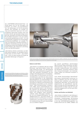 FR%u00c4SEN BOHREN DREHEN STECHEN INDUSTRIENTECHNOLOGIEDie CHATTERFREE-Vollhartmetall-Fr%u00e4ser von ISCAR eignen sich f%u00fcr das Schruppen und Schlichten von ISO-M- und ISO-P-Werkstoffen. Die Werkzeuge mit ECY-S5-Geometrie besitzen f%u00fcnf Schneiden mit variabler Teilung und zus%u00e4tzlichem Spanraum. Ihre unterschiedlichen Spanwinkel erlauben einen sehr weichen Schnitt, das besondere Design verz%u00f6gert den Verschlei%u00df und erh%u00f6ht die Standzeit.Die EC-E4M-CF-Geometrie ist f%u00fcr die mittlere und schnelle Bearbeitung von ISO-S-, -M- und -H-Werkstoffen ausgelegt. Die vierschneidigen 38-Grad-Helix-Schaftfr%u00e4ser mit variabler Teilung und zahlreichen Eckradius-Varianten erm%u00f6glichen Schnitttiefen bis 2xD. Ihre geringe Auskragung und das CHATTERFREE-Design verhindern Rattern oder Vibrationen und erm%u00f6glichen top Oberfl%u00e4cheng%u00fcten.%u201eBeim Bohren, Stechen und Drehen von Edelstahl stehen Zerspaner vor denselben Herausforderungen wie beim Fr%u00e4sen%u201c, sagt Herbert Volk. %u201eAuch f%u00fcr diese Prozesse hat ISCAR die passenden Werkzeuge im Programm.%u201c Speziell f%u00fcr das effektive Schruppen von Schultern in ISO-Sund ISO-M-Materialien hat ISCAR den neuen tangentialenWendelschaftfr%u00e4ser HELITANG-SM entwickelt.Bohren in alle Tiefen%u201eBeim Bohren von Edelstahl z%u00e4hlt die richtige Mischung%u201c, sagt Patrick Muller, Product Manager Drilling bei ISCAR. %u201eF%u00fcr %u00fcberzeugende Ergebnisse ist die Kombination aus guter K%u00fchlung, dem passenden Schneidstoff und der richtigen Schneidengeometrie entscheidend.%u201c F%u00fcr Bohrungen mit Durchmessern von f%u00fcnf bis 32,9 Millimetern und Tiefen bis 12xD in ISO-Mund ISO-S-Werkstoffen ist der SUMOCHAMWechselkopfbohrer mit zweischneidigem ICMBohrkopf die erste Wahl. Er besitzt einen Spitzenwinkel von 140 Grad, eine Schutzfase an der Schneidkante und besteht aus der verschlei%u00dffesten, TiAlN PVD-beschichteten Feinstkornsorte IC908. Interne K%u00fchlmittelkan%u00e4le bringen das K%u00fchlmittel direkt in die Schnittzone.Das optimiert die W%u00e4rmeabfuhr und Spanevakuierung, sorgt f%u00fcr hohe Oberfl%u00e4chenqualit%u00e4ten und erm%u00f6glicht lange Standzeiten.%u201eWerden tiefere Bohrungen ben%u00f6tigt, bieten sich die Einlippentieflochbohrer aus der TRIDEEP-Familie an%u201c, sagt Patrick Muller. %u201eIm Standard sind sie in Durchmessern von acht bis 32 Millimetern und L%u00e4ngen bis 25xD verf%u00fcgbar.Als Sonderwerkzeug sind auch Gesamtl%u00e4ngen von zu 4,5 Metern m%u00f6glich.%u201c Die speziell geschliffenen dreischneidigen WSP mit breiter Wiper-Schlichtfase und Spanteiler-Geometrie sorgen f%u00fcr stabile Prozesse, vermeiden Aufbauschneiden und verbessern die Spanabfuhr. Anwender profitieren neben dem ressourcenschonenden und kostensparenden Aufbau von effizienten Prozessen in Edelst%u00e4hlen.Auch ISCARs dreischneidiges Wechselkopfbohr-System QUICK3CHAM funktioniert tadellos in Edelstahl, etwa der neue F3B-Flachbohrkopf beim Aufbohren auch exzentrisch angebrachter Bohrungen. Die Geometrie der Hauptschneide mit geschliffenem Span-Deflektor erzeugt sehr kleine Spansegmente. Die Nebenschneide mit Wiper sorgt f%u00fcr eine optimale Bohrungsgeometrie und sehr gute Oberfl%u00e4chenqualit%u00e4t.Drehen und Stechen von Edelstahl%u201eBeim Drehen in Edelstahl ist die K%u00fchlung einer der entscheidenden Punkte%u201c, sagt Frederik Schmalbach, Produktmanager Non-Rotating Tools bei ISCAR. Deshalb laufen beispielsweise bei den JETRTURN-Werkzeughaltern aus ISCARs JETCUT-Linie f%u00fcr CNMG-, WNMG- und ISCARs dreischneidiges Wechselkopfbohr-System QUICK3CHAM funktioniert tadellos in Edelstahl, etwa der neue F3B-Flachbohrkopf zum Aufbohren auch exzentrisch angebrachter Bohrungen.62