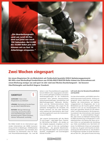Zwei Wochen eingespartBei einem Ringstutzen f%u00fcr ein Winkelst%u00fcck sah Fluidtechnik-Spezialist EISELE Optimierungspotenzial. Mit Hilfe eines Wechselkopf-Sonderfr%u00e4sers aus ISCARs MULTI-MASTER-Reihe kommt das Unternehmen mit einem Werkzeug weniger aus und spart im Jahr rund zwei Wochen Bearbeitungszeit %u2013 bei besserer Oberfl%u00e4cheng%u00fcte und deutlich l%u00e4ngerer Standzeit.Die EISELE GmbH ist ein international agierendes Unternehmen der HENN Connector Group mit Sitz in Waiblingen. 130 Mitarbeiter entwickeln, produzieren und vertreiben dort Anschl%u00fcsse aus Ganzmetall, etwa f%u00fcr Fluidund Pneumatikanwendungen. Vor rund 80 Jahren in der Pneumatikbranche gegr%u00fcndet, hat sich EISELE in den vergangenen Jahrzehnten zu einem gefragten Anbieter innovativer Verbindungsl%u00f6sungen f%u00fcr die Fluidtechnik entwickelt. Dazu geh%u00f6ren Steckanschl%u00fcsse,Schlauchverschraubungen, Schnellschluss- und Mehrfachkupplungen. Weltweite Distributoren und das Tochterunternehmen Eisele Connectors in Michigan, USA, sorgen f%u00fcr die weltweite Verf%u00fcgbarkeit der Produkte. Die Kunden kommen aus fast allen Branchen, unter anderem der Laserindustrie, dem Foodund Beveragebereich sowie der Automatisierung und Robotik.%u201eBei unseren Komponenten gilt das Motto %u201afit and forget%u2018%u201c, sagt Ralph Kaun, Teamleiter CNC-Drehen bei EISELE. %u201eSie werden an ihre Aufgabe angepasst, eingebaut und halten dann %u2013 ganz im Sinn des nachhaltigen Wirtschaftens %u2013 das gesamte Maschinenleben lang. Deshalb haben f%u00fcr unsere Kunden Qualit%u00e4t, Langlebigkeit und Zuverl%u00e4ssigkeit h%u00f6chste Priorit%u00e4t.%u201cLuft nach oben bei Benutzerfreundlichkeit und Qualit%u00e4tUm das sicherzustellen, pr%u00fcft EISELE seine Produktionsprozesse kontinuierlich. Anfang vergangenen Jahres stie%u00df Kaun bei einem der Topseller des Unternehmens auf Optimierungspotenzial: ein Ringstutzen, der in ein Winkelst%u00fcck aus der Inoxline geh%u00f6rt. Hierbei handelt es sich um ein Anschlusssystem mit einer ganz speziellen Technik f%u00fcr die Lebensmittel- und Pharmaindustrie. Die Komponente produziert das Unternehmen viele tausend Mal pro Jahr %u2013 in unterschiedlichen Baugr%u00f6%u00dfen, aber immer aus Edelstahl. Bislang fertigte EISELE die Bohrung im Ringstutzen in drei Arbeitsschritten. Erst bohrte das Team mit einem 10,5er vor und spindelte die Vertiefung aus, fr%u00e4ste anschlie%u00dfend eine 16er-Stufe mit einem 15,2-Millimeter-Fr%u00e4ser auf und spindelte diese aus. Zu guter Letzt brachte ein Senkwerkzug eine 60-Grad-Fase ein. Das Problem: Pro Ringstutzen standen am Ende 325 Sekunden auf der Uhr. %u201eDer ganze Prozess hat ewig %u201eDie Bearbeitungszeit sank um rund 40 Prozent auf jetzt nur noch 196 Sekunden. Bei 8.000 bis 10.000 Teilen pro Jahr k%u00f6nnen wir so fast 14 Arbeitstage einsparen.%u201cSHORTCUTAUFGABE: Fr%u00e4sen eines Ringstutzens aus EdelstahlL%u00d6SUNG: Wechselkopf-Sonderfr%u00e4ser aus der MULTI-MASTER-ReiheNUTZEN: Weniger Werkzeuge notwendig, benutzerfreundlich, hohe Oberfl%u00e4cheng%u00fcte, k%u00fcrzere Bearbeitungszeit, h%u00f6here Standzeit, h%u00f6herer Teileaussto%u00df, nachhaltigi12
