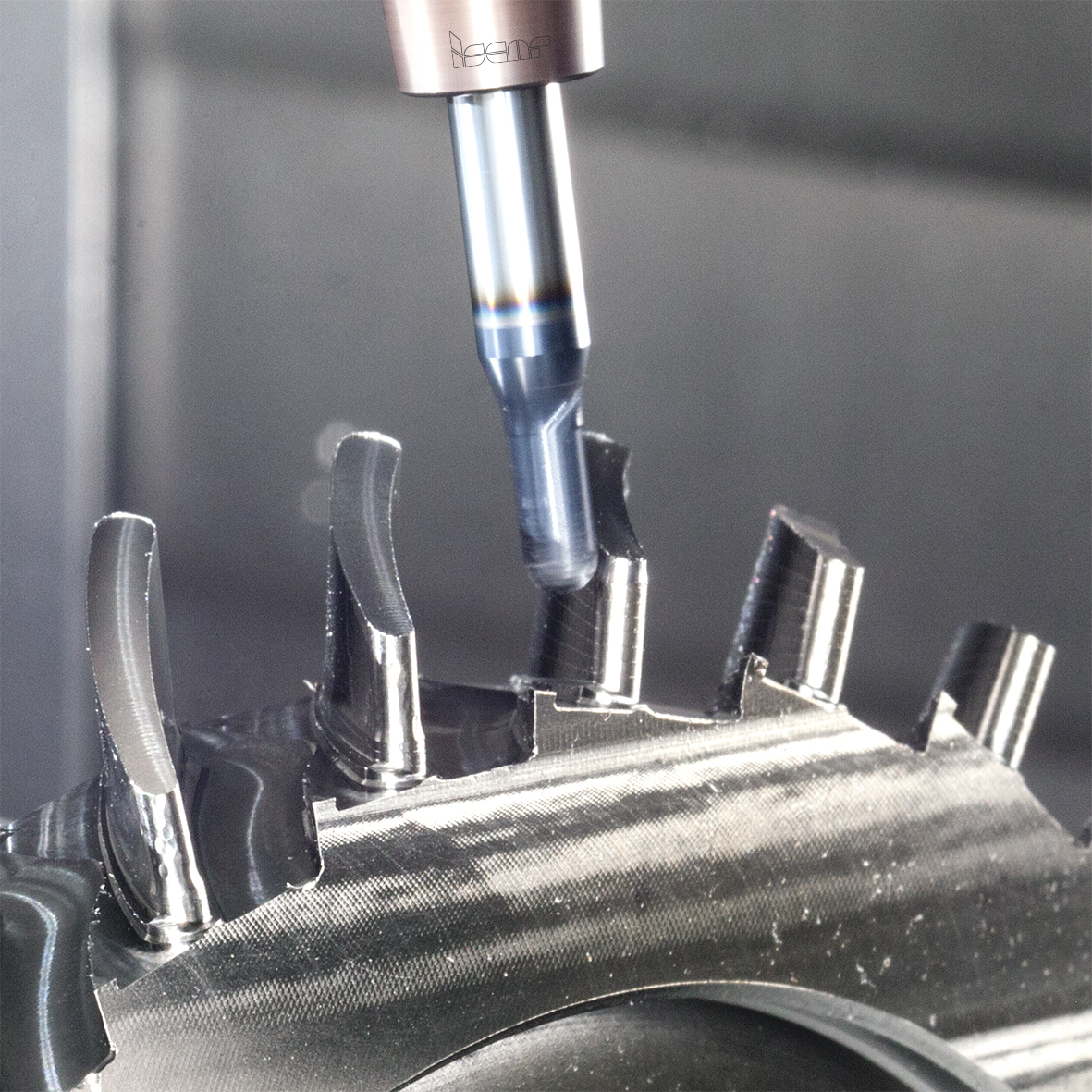 圖 3 – 伊斯卡 MULTI-MASTER 可更換刀頭用於擺線銑削難切削鈦合金。圖 4 – 使用安裝在熱縮筒夾中的多刃鎢鋼立銑刀對整體葉盤進行擺線粗銑。
